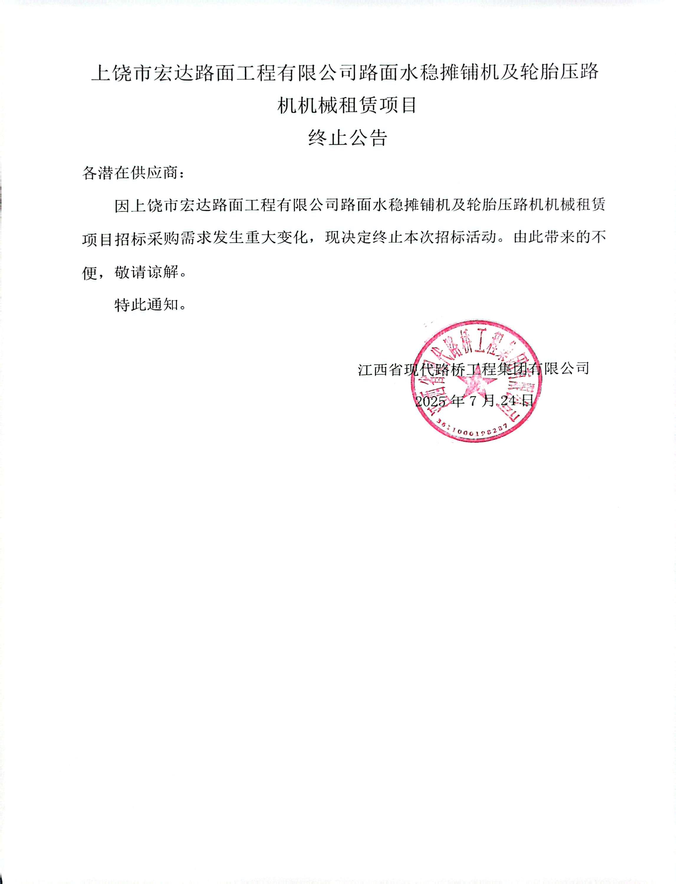 【終止公告】上饒市宏達路面工程有限公司路面水穩攤鋪機及輪胎壓路機機械租賃項目終止公告